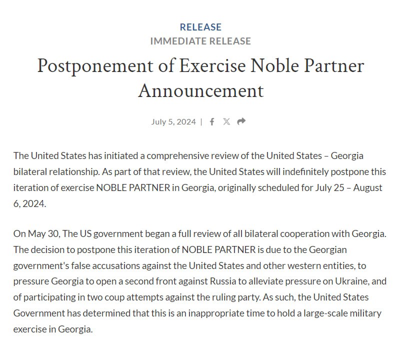 "30 мая правительство США начало полный пересмотр всего двустороннего сотрудничества с Грузией. Решение отложить реализацию проекта Noble Partner обусловлено ложными обвинениями грузинского правительства в адрес США и других западных стран в попытке оказать давление на Грузию с целью открытия второго фронта против России, чтобы облегчить давление на Украину, а также в участии в двух попытках государственного переворота против правящей партии. Таким образом, правительство Соединенных Штатов решило, что сейчас неподходящее время для проведения крупномасштабных военных учений в Грузии", - объяснили отмену в ведомстве.