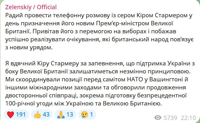 "Я благодарен Киру Стармеру за заверение, что поддержка Украины со стороны Великобритании будет оставаться неизменно принципиальной. Мы скоординировали позиции перед саммитом НАТО в Вашингтоне и другими международными мероприятиями и обсудили продолжение двустороннего сотрудничества, включая подготовку беспрецедентного 100-летнего соглашения между Украиной и Великобританией", – заявил Зеленский.