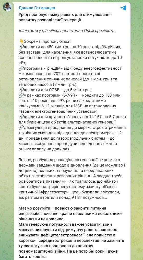 Гетманцев добавил, что развитие распределенной генерации не снимает с государства задачи восстановления (где это возможно и целесообразно) крупных генерирующих и передающих объектов, а также создания резервных решений.