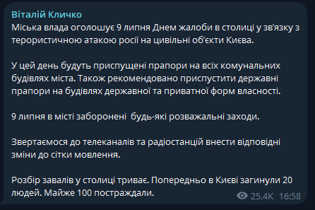 В Киеве городские власти объявили 9 июля днем траура в связи с ударом по гражданским объектам столицы, из-за которых погибли люди.