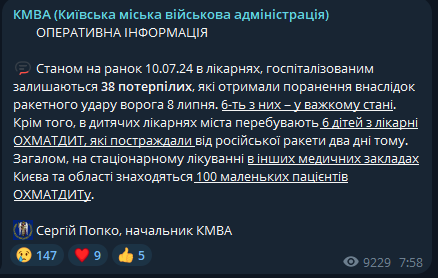 По данным КГВА, на утро 10 июля в больницах остаются 38 пострадавших, из которых 6 находятся в тяжелом состоянии. В детских больницах города находятся 6 детей из больницы "Охматдет", пострадавших от российской ракеты два дня назад. В целом в других медицинских учреждениях Киева и области на стационарном лечении находятся 100 пациентов "Охматдета".