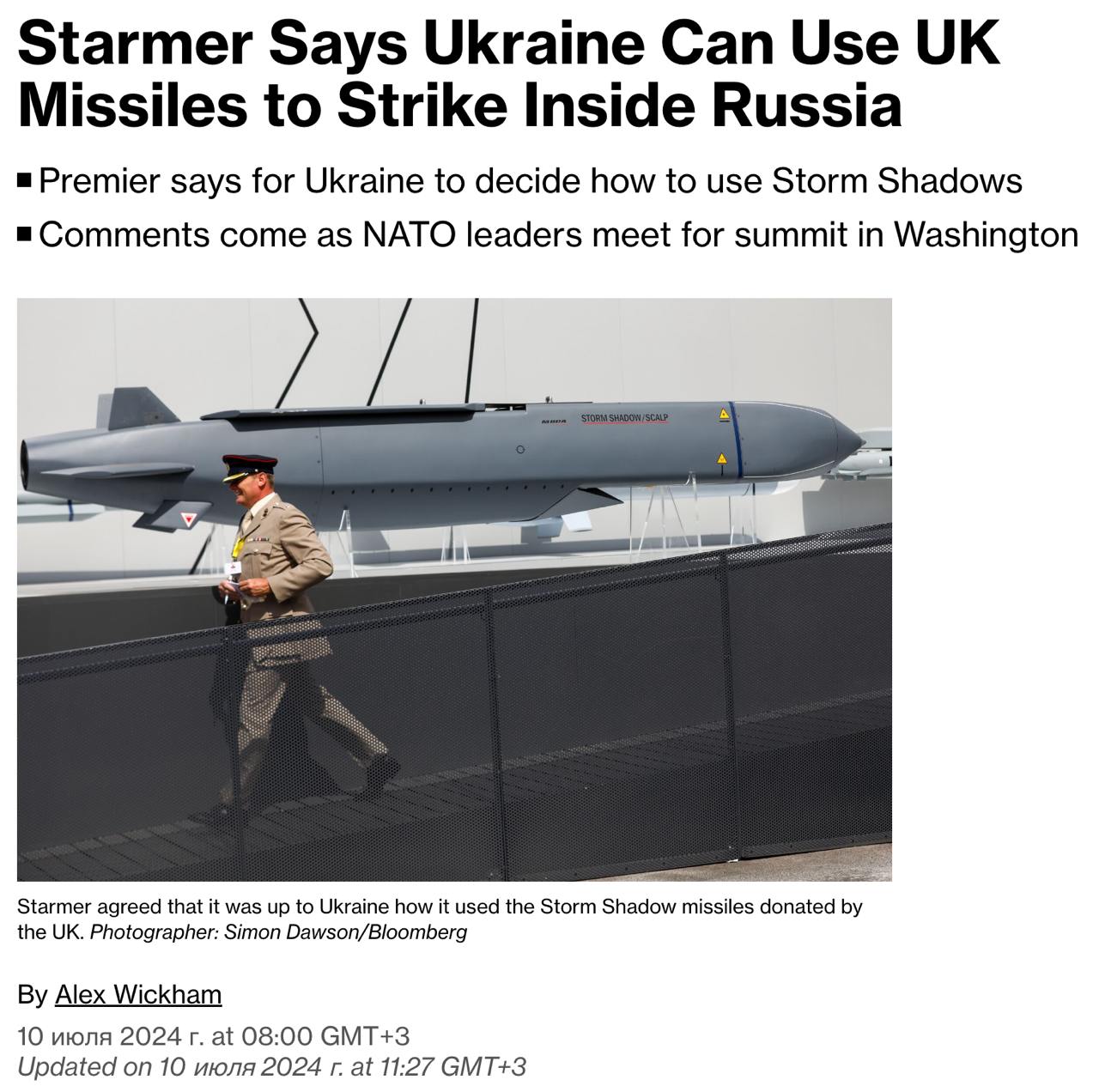Новый премьер-министр Великобритании Кир Стармер заявил в Вашингтоне, что Киев должен сам решать, как использовать британские ракеты, "в соответствии с международным гуманитарным правом" и "в оборонительных целях".