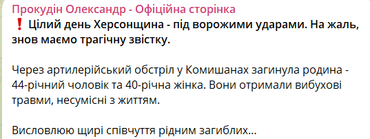 "Из-за артиллерийских обстрелов в Камышанах погибла семья - 44-летний мужчина и 40-летняя женщина. Они получили взрывные травмы, несовместимые с жизнью", - написал он.