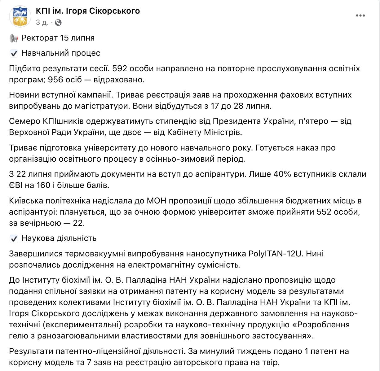"С 22 июля принимают документы на поступление в аспирантуру. Только 40% поступающих сдали ЕВИ (единый вступительный экзамен - Ред.) на 160 и более баллов. Киевская политехника направила в МОН предложения по увеличению бюджетных мест в аспирантуре: планируется, что по очной форме университет сможет принять 552 человека, по вечерней — 22", - отмечается в посте.