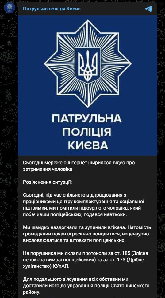Полиция заявила, что они обратили внимание на подозрительного мужчину, который, увидев патруль с сотрудниками ТЦК, начал убегать.