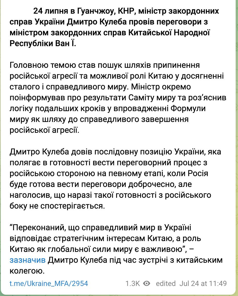"Украина придает большое значение мнению Китая и внимательно изучила "консенсус из шести пунктов", достигнутый Китаем и Бразилией по политическому урегулированию украинского кризиса. Украина желает и готова участвовать в диалоге и переговорах с Россией. Конечно, переговоры должны быть разумными и предметными, нацеленными на достижение справедливого и прочного мира", - цитируется в сообщении Пекина позиция Кулебы.