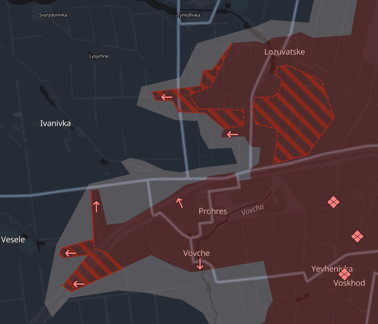 Российские войска за сутки снова продвинулись на Покровском направлении. Они подошли к селам Веселое, Лисичное и Тимофеевка, продвинувшись на запад от недавно захваченного Прогресса.