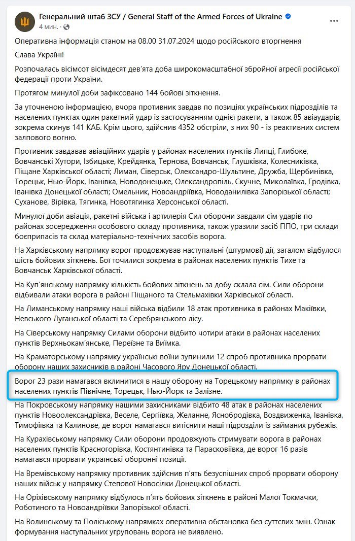 "Враг 23 раза пытался вклиниться в нашу оборону на Торецком направлении в районах населённых пунктов Северное, Торецк, Нью-Йорк и Железное", - пишет Генштаб.