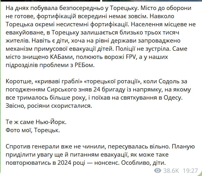 «Город к обороне не готов, фортификаций внутри нет совсем. Вокруг Торецка отдельные несистемные фортификации. Население местное не эвакуировано, в Торецке остается около трех тысяч человек. Даже есть дети, хотя на уровне государства введен механизм принудительной эвакуации детей. Полиции не встретила. Сам город уничтожен КАБами, охотятся вражеские FPV, а у наших подразделений проблемы с РЭБом. Короче, «кровавые грабли» «торецкой ротации», когда Содоль по согласованию Сырского снял 24 бригаду с направления, на котором все держалось больше года, и уехал на празднование в Одессу. Конечно, россияне воспользовались», – написала Безуглая.