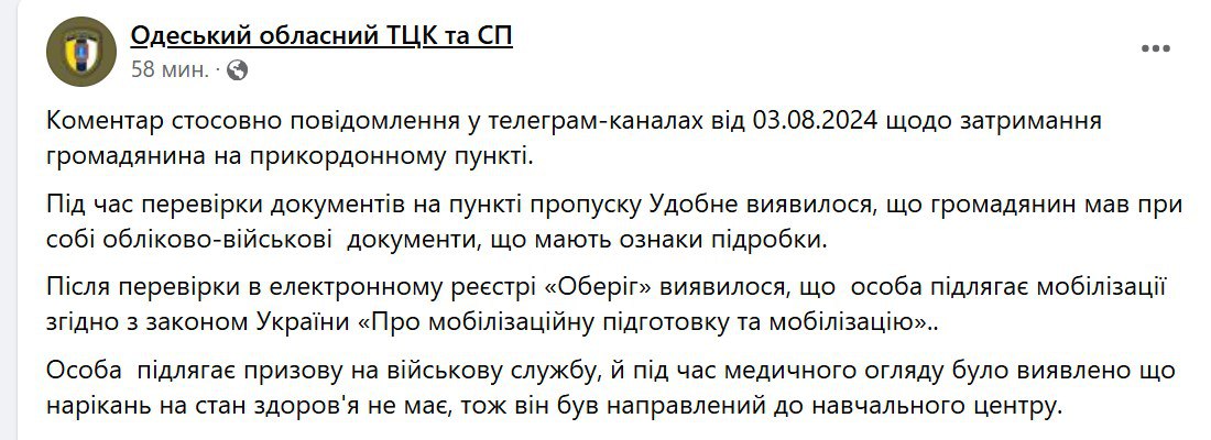 Одесский областной ТЦК заявил, что военно-учетные документы мужчины "имели признаки подделки". В дальнейшем было установлено, что он подлежит мобилизации и не имеет отсрочек. Поэтому мужчину направили в учебный центр ВСУ.
