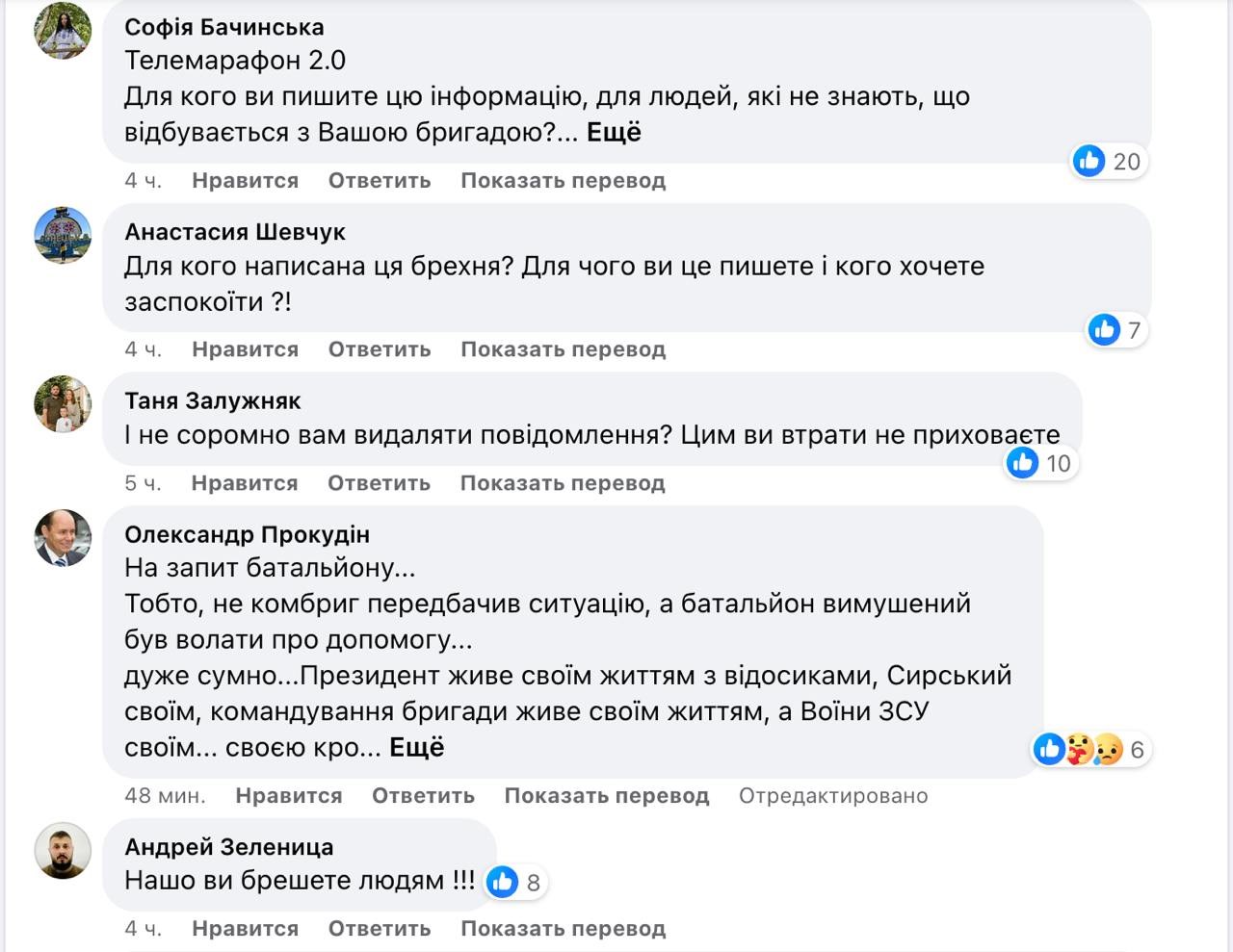 "Ложь. Все, кто причастен к вашей бригаде, знают "отношение" высших командиров к бойцам. Вместо этой писанины, вы бы лучше делали действительно нужную работу для сохранения жизни личного состава", - пишет, к примеру, Олеся Лукьянчук.