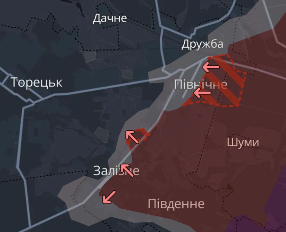 По данным паблика Deep State, на восточных подступах к Торецку российские войска продвинулись в Северном и Железном. Военный аналитик Bild Юлиан Рёпке, ссылаясь на геолоцированные видео, пишет, что Железное захвачено на 90%.