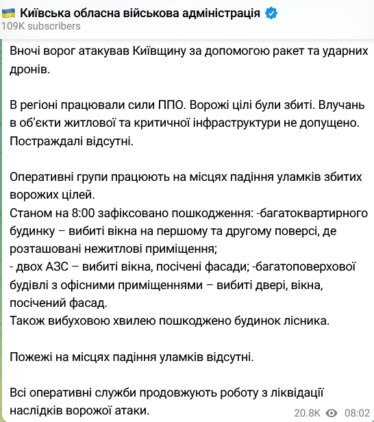 В Киевской области обломками от ночной атаки РФ повреждены многоэтажка, две АЗС, многоэтажное здание с офисами и дом лесника.