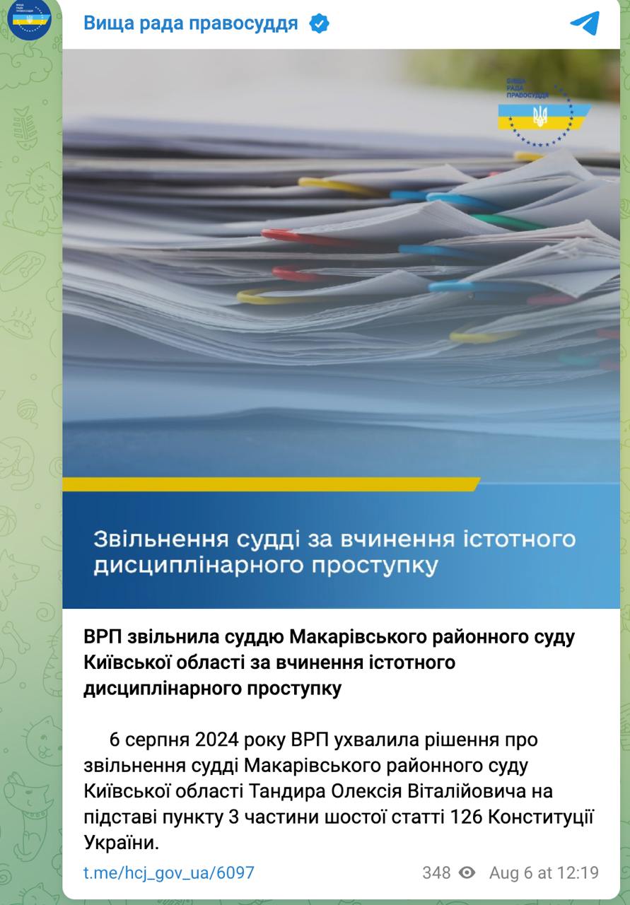 "6 августа Высший совет правосудия принял решение об увольнении судьи Кассационного административного суда в составе Верховного суда Князева Всеволода Сергеевича на основании пункта 3 части шестой статьи 126 Конституции Украины. 6 августа ВСП принял решение об увольнении судьи Макаровского районного суда Киевской области Тандыра Алексея Витальевича на основании пункта 3 части шестой статьи 126 Конституции Украины", - сказано в публикациях.