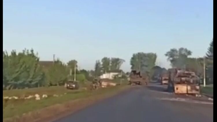В сети публикуют видео, как сообщается, атакованной ракетами HIMARS российской колонны техники в районе Рыльска Курской области.