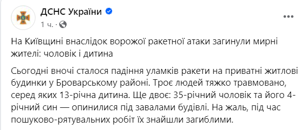 Во время ночной воздушной атаки РФ в Броварском районе Киевской области погибли отец и 4-летний сын. Три человека тяжело травмированы, среди них 13-летний ребенок.