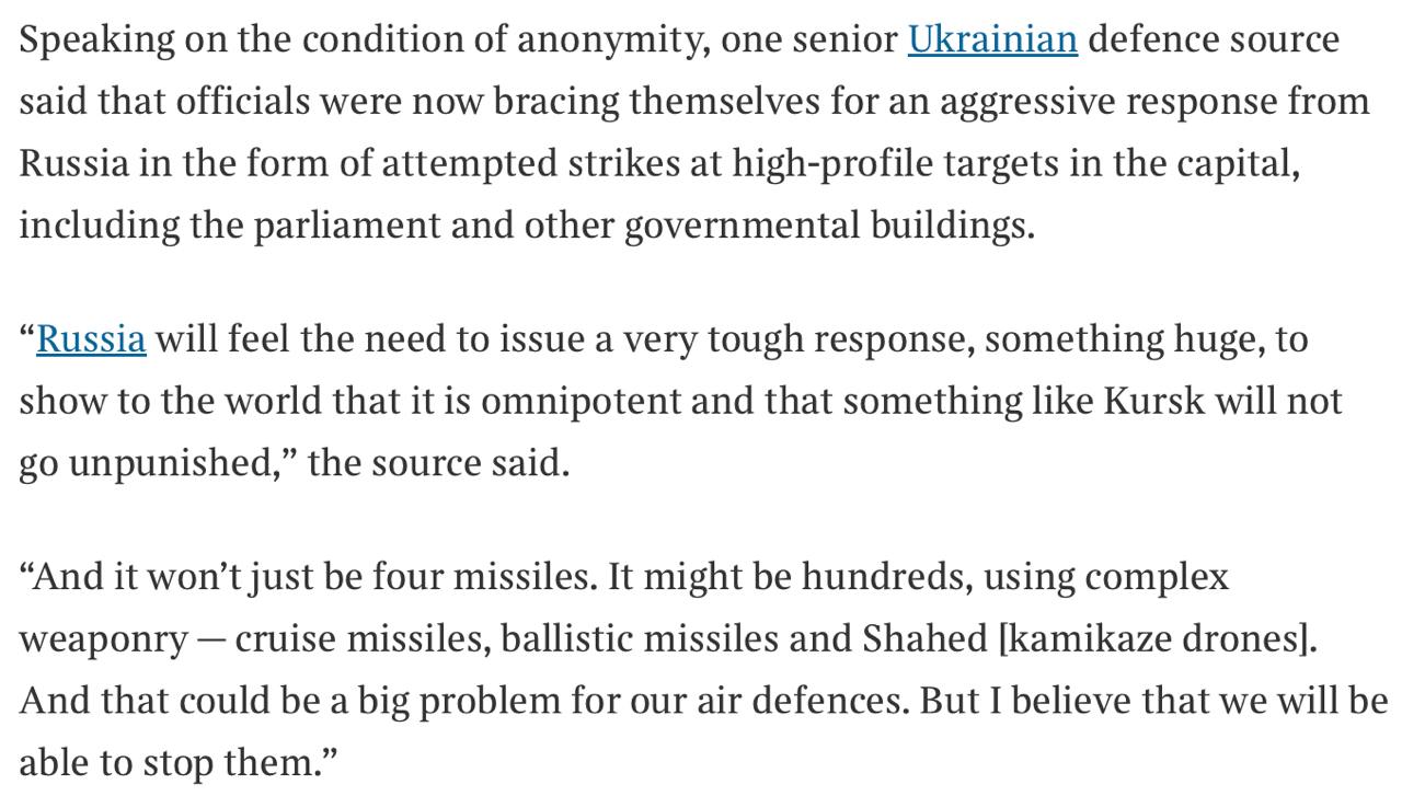 "Россия чувствует необходимость дать очень жесткий ответ, нечто грандиозное, чтобы показать миру, что она всемогуща и что нечто вроде Курска не останется безнаказанным", - сказал источник издания.