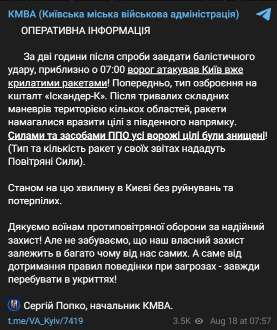 Через два часа после попытки нанести баллистический удар, примерно в 07:00 враг атаковал Киев уже крылатыми ракетами. Предварительно, тип вооружения типа "Искандер-К".