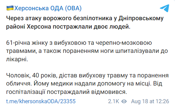 14:37 Россияне атаковали с беспилотника Днепровский район Херсона. Пострадали два человека. Об этом сообщает Херсонская ОВА.