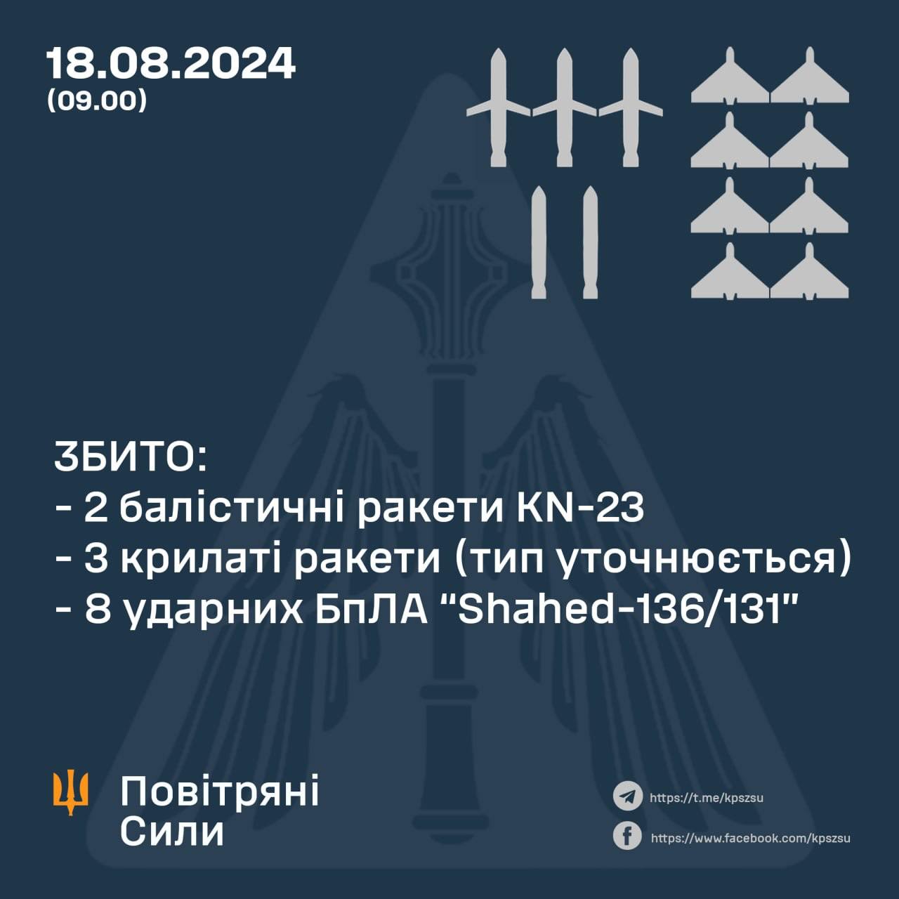 09:36 За ночь ВСУ сбили пять из восьми ракет, сообщают Воздушные силы. А также все восемь "Шахедов".
