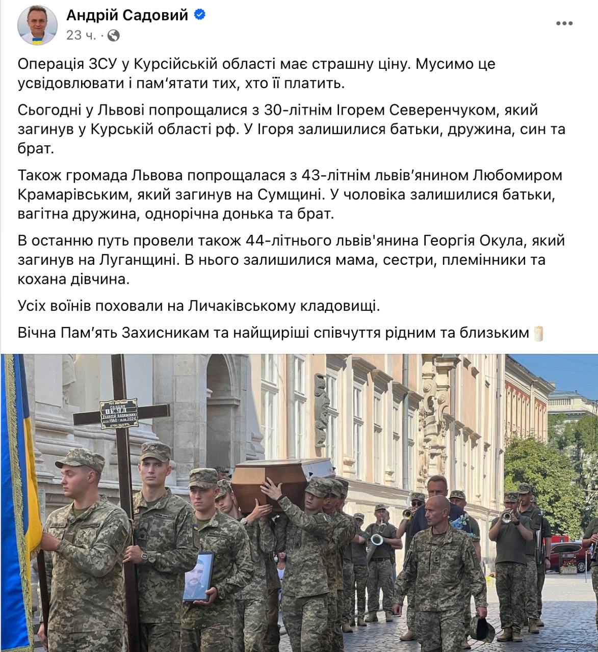 11:52 Операция ВСУ в Курской области "имеет свою страшную цену", заявил мэр Львова Андрей Садовой.