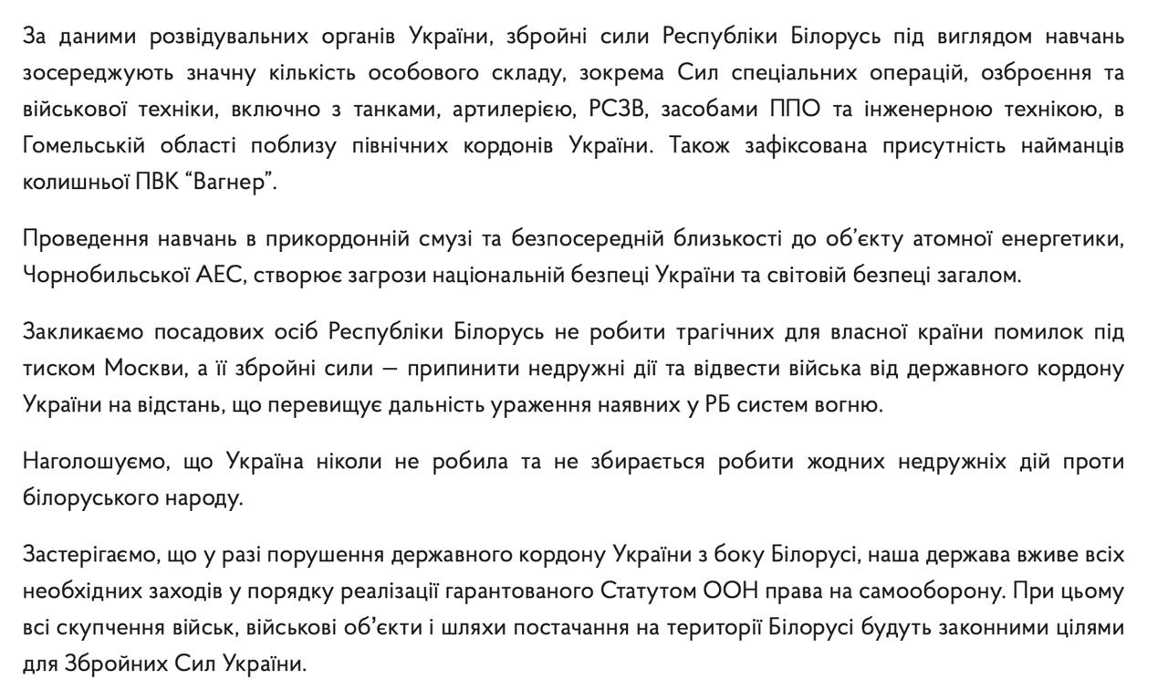 "Предупреждаем, что в случае нарушения государственной границы Украины со стороны Беларуси наше государство примет все необходимые меры в порядке реализации гарантированного Уставом ООН права на самооборону. При этом все скопления войск, военные объекты и пути снабжения на территории Беларуси будут законными целями для Вооруженных сил Украины", - заявили в МИД.