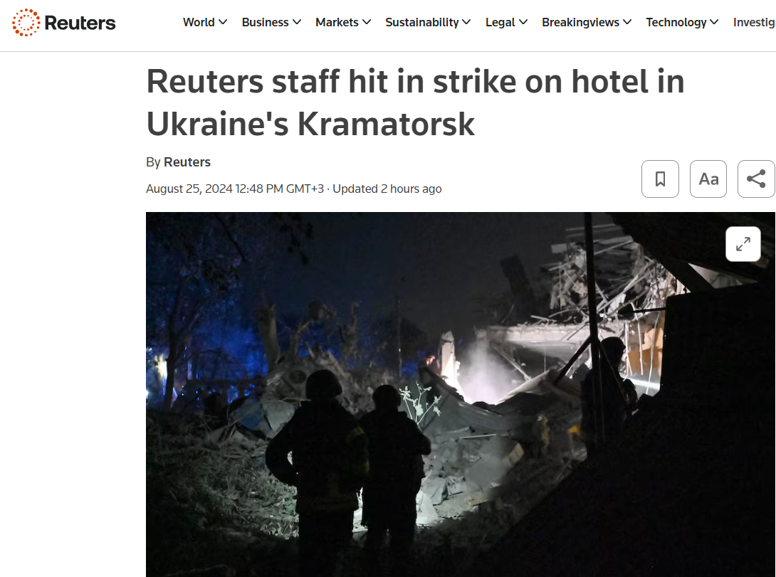 14:10 Репортеры Reuters пострадали в результате российского ракетного удара по гостинице "Сапфир" в Краматорске, сообщает агентство.