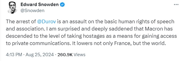 "Арест Дурова — это посягательство на базовые права человека на свободу слова и объединений. Я удивлен и глубоко опечален тем, что Макрон опустился до уровня захвата заложников как способа получения доступа к личным сообщениям. Это унижает не только Францию, но и весь мир", — написал Сноуден.
