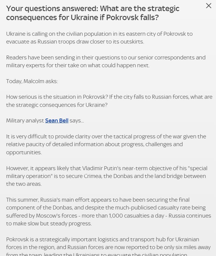 Для украинских сил Покровск является стратегически важным логистическим и транспортным узлом. Путин знает, что зимой очень трудно сохранять темп наступления, поэтому у него есть 10-12 недель для достижения своих целей до того, как установится зимняя погода.