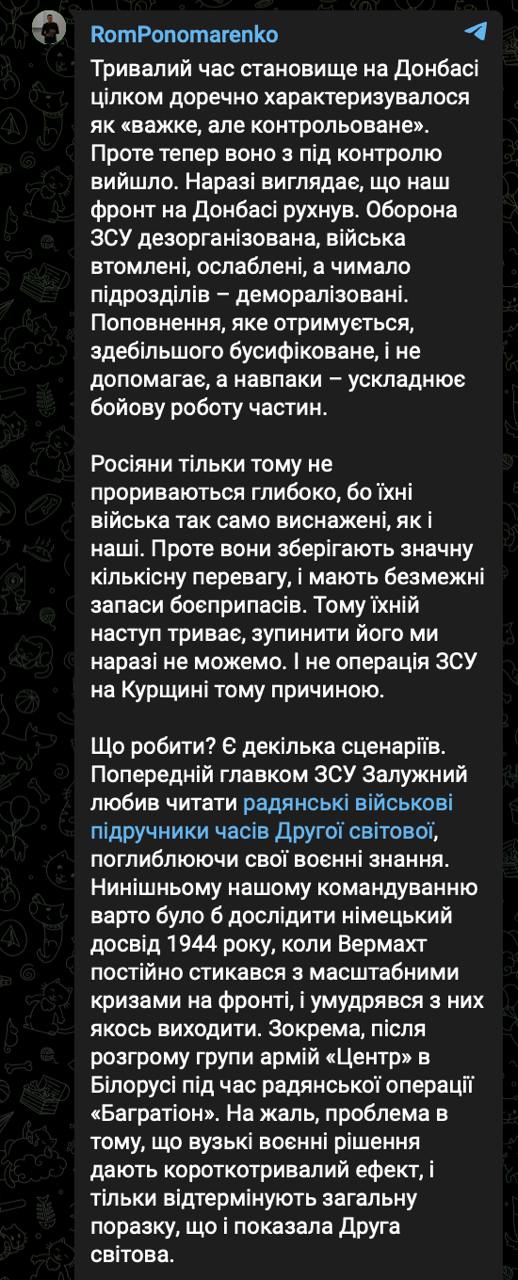 При этом офицер "Азов" предлагает перенять некий опыт гитлеровского "Вермахта", как он стабилизировал фронт после крупных поражений (вроде операции "Багратион" в 1944 году). При этом признает, что эти решения "дают только краткосрочный эффект и лишь оттягивают общее поражение".