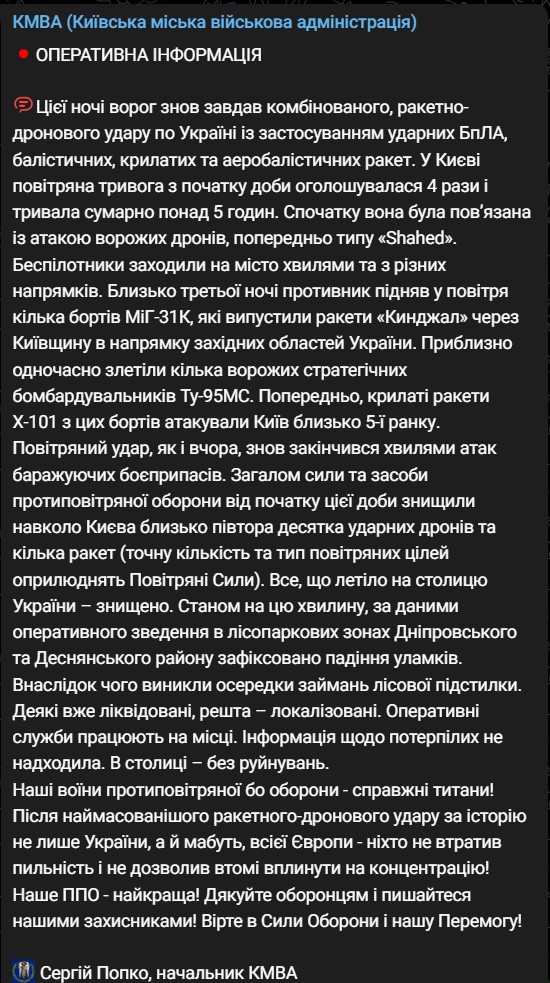 08:54 Киев этой ночью сперва атаковали "Шахеды", затем крылатые ракеты Х-101, после которых снова пошли беспилотники. Также через Киевскую область пролетели "Кинжалы" в сторону западных областей, сообщили в столичной военной администрации.