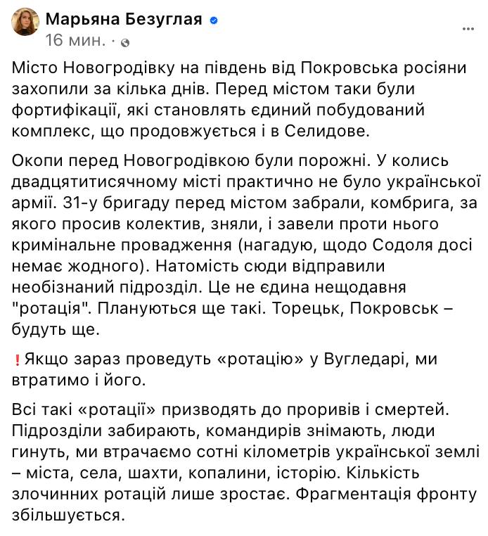 Россияне захватили Новогродовку на Покровском направлении за несколько дней, хотя там были фортификации. Об этом пишет народный депутат Марьяна Безуглая.