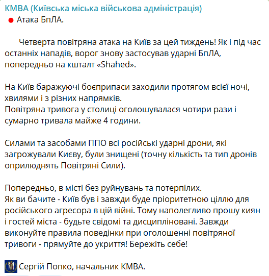Баражирующие боеприпасы атаковали столицу всю ночь, волнами и по разным направлениям. Воздушная тревога в столице объявлялась четыре раза и продолжалась почти 4 часа.
