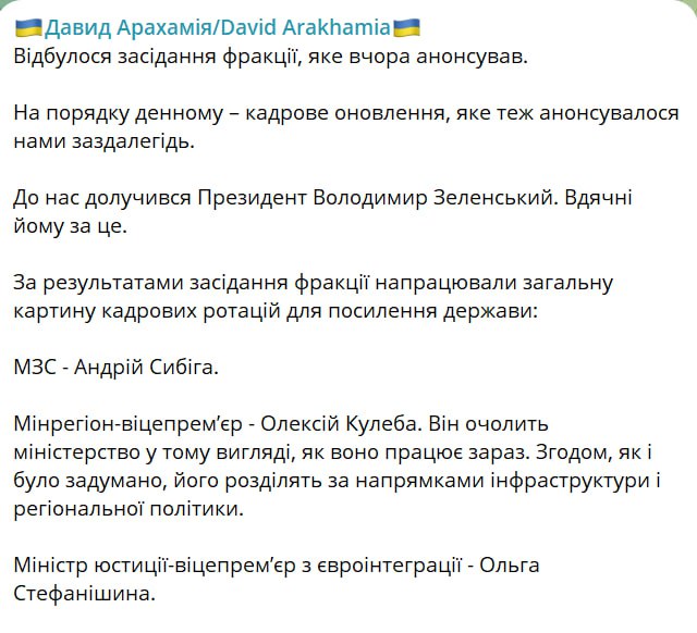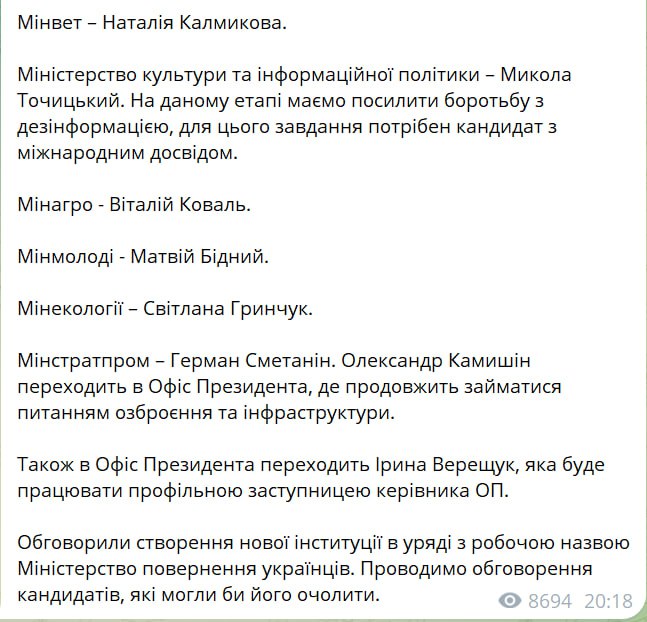 Вскоре глава фракции "Слуги народа" Давид Арахамия в своем телеграм-канале подтвердил информацию о кандидатурах новых министров. Также он написал, что бывший министр стратегических отраслей промышленности Александр Камышин переходит на работу в Офис президента.