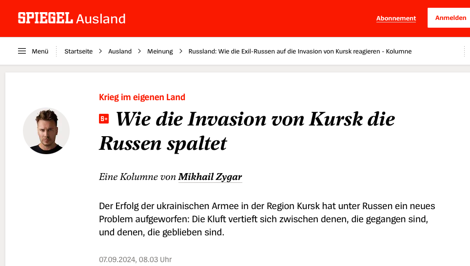 Журналист Михаил Зыгарь написал статью в Der Spiegel о том, как наступление украинской армии в Курской области усилило раскол между россиянами — уехавшими из страны и оставшимися. А также раскол внутри российских либералов.