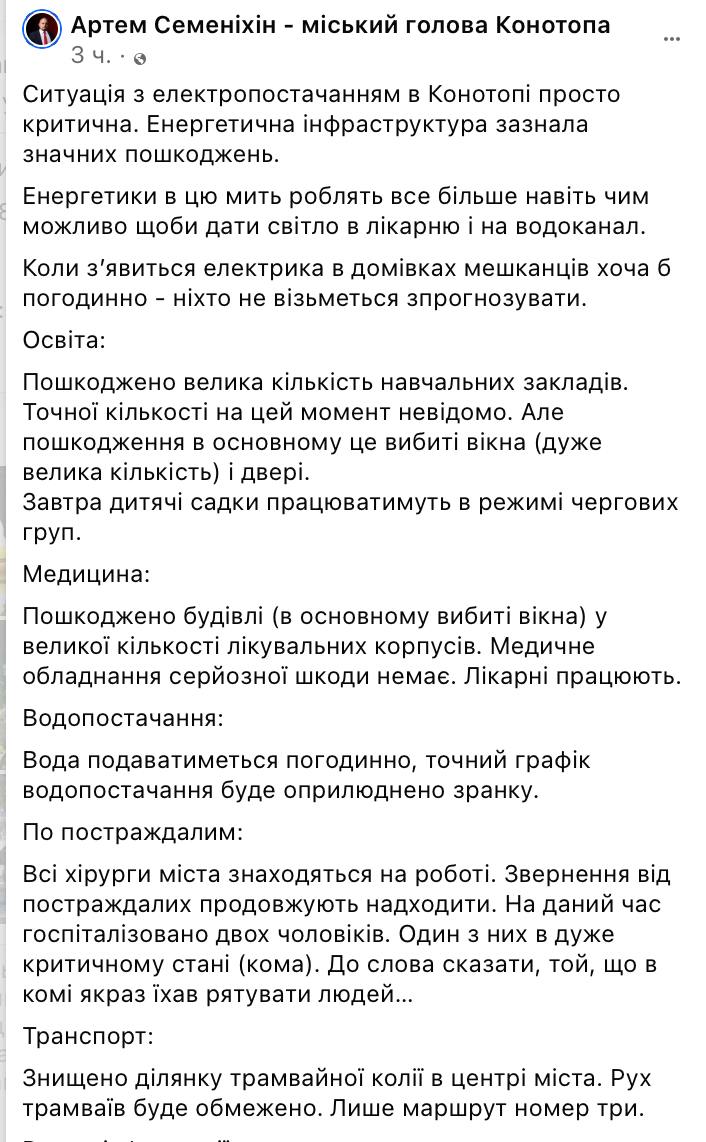 «Ситуация с электроснабжением в Конотопе просто критическая. Энергетическая инфраструктура получила значительные повреждения.