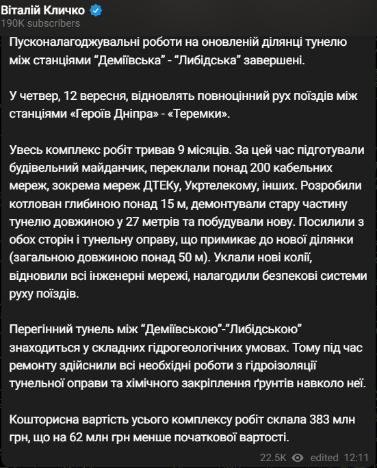 "Перегонный тоннель между "Демиевской"-"Лыбидской" находится в сложных гидрогеологических условиях. Поэтому при ремонте осуществили все необходимые работы по гидроизоляции туннельной оправы и химическому закреплению грунтов вокруг нее", - написал мэр.