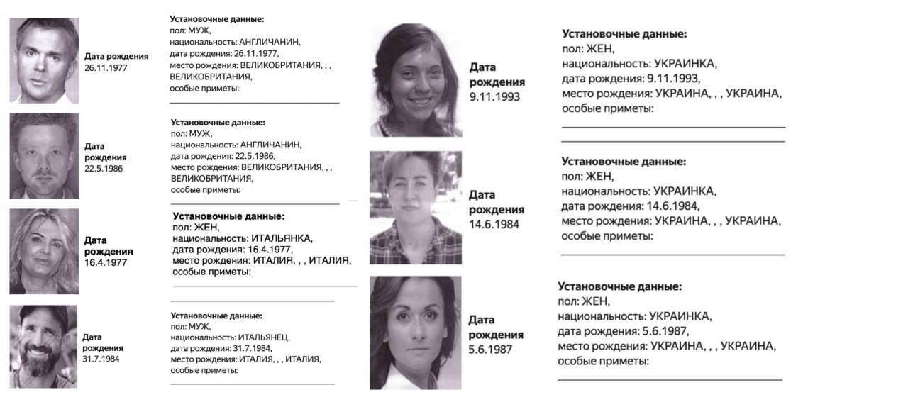Согласно базе МВД, в розыск объявлены Ник Уолш из CNN, Стефани Баттистини и Симони Трайни из RAI, Николас Конолли из Deutsche Welle, а также Наталья Нагорная, Диана Буцко и Олеся Боровик из украинских изданий.