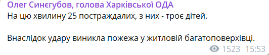 "К этой минуте 25 пострадавших, из них трое детей. В результате удара возник пожар в жилой многоэтажке", - сообщил Синегубов.