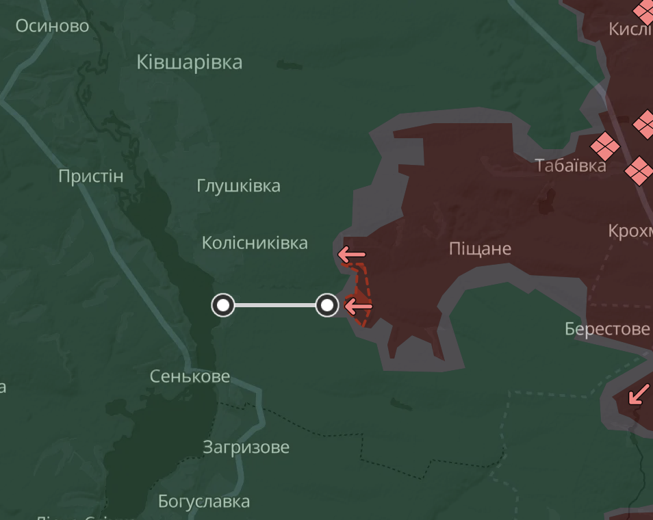 По его данным, за последнюю неделю россияне сумели существенно расширить свое вклинение в районе Песчаного, до Кругляковки и Колесниковки остается около трех километров. Карта Deep State подтверждает продвижение россиян на этом участке за минувшие сутки.