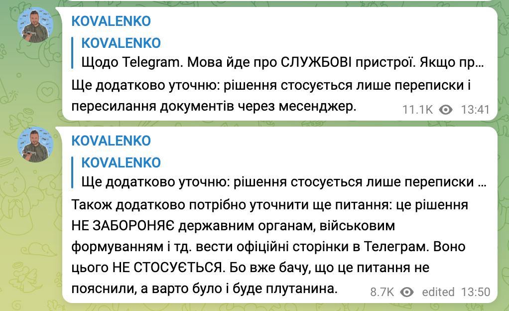 "Было принято решение о запрете установки и использования Telegram на служебных устройствах работников органов государственной власти, военнослужащих, работников сектора безопасности и обороны, а также предприятий – операторов критической инфраструктуры", - говорится в сообщении.