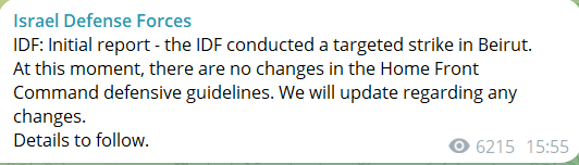 СМИ пишут, что был обстрелян южный пригород ливанской столицы - район Дахия, где находятся штабы "Хезболлы". Есть информация о гибели члена руководства организации Ибрагим Акил.