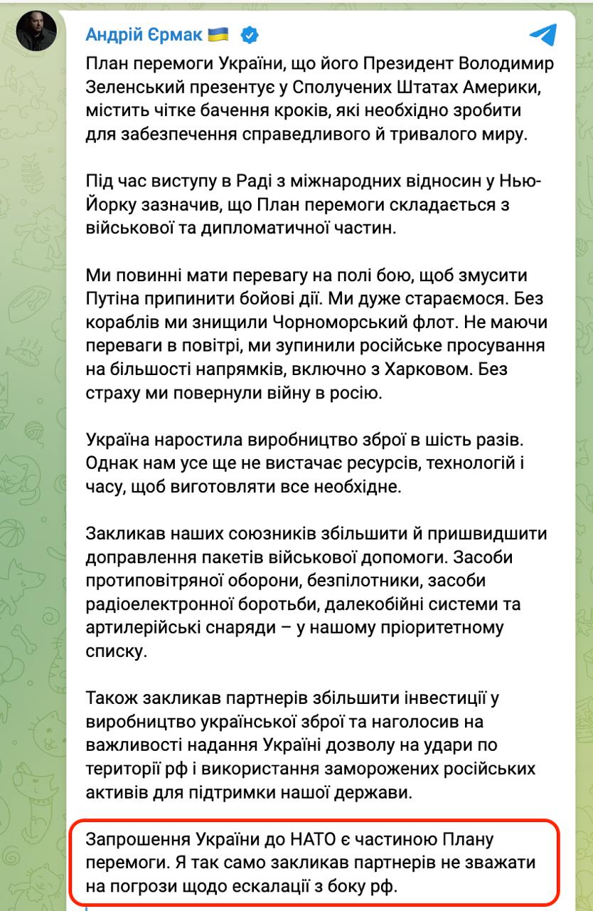 "Приглашение Украины в НАТО является частью плана победы. Я также призвал партнёров не учитывать угрозы эскалации со стороны России", — сказано в публикации главы ОП.