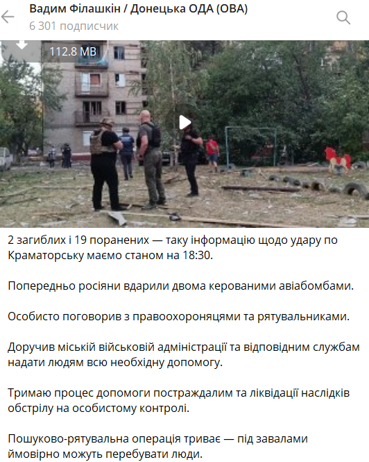 Филашкин опубликовал фото последствий удара по Краматорску.