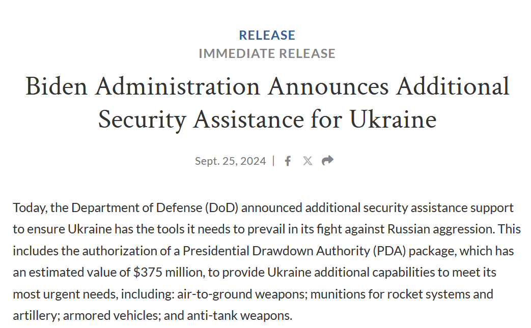 Байден объявил о новом пакете военной помощи Украине. Что войдет в поставку на $375 миллионов