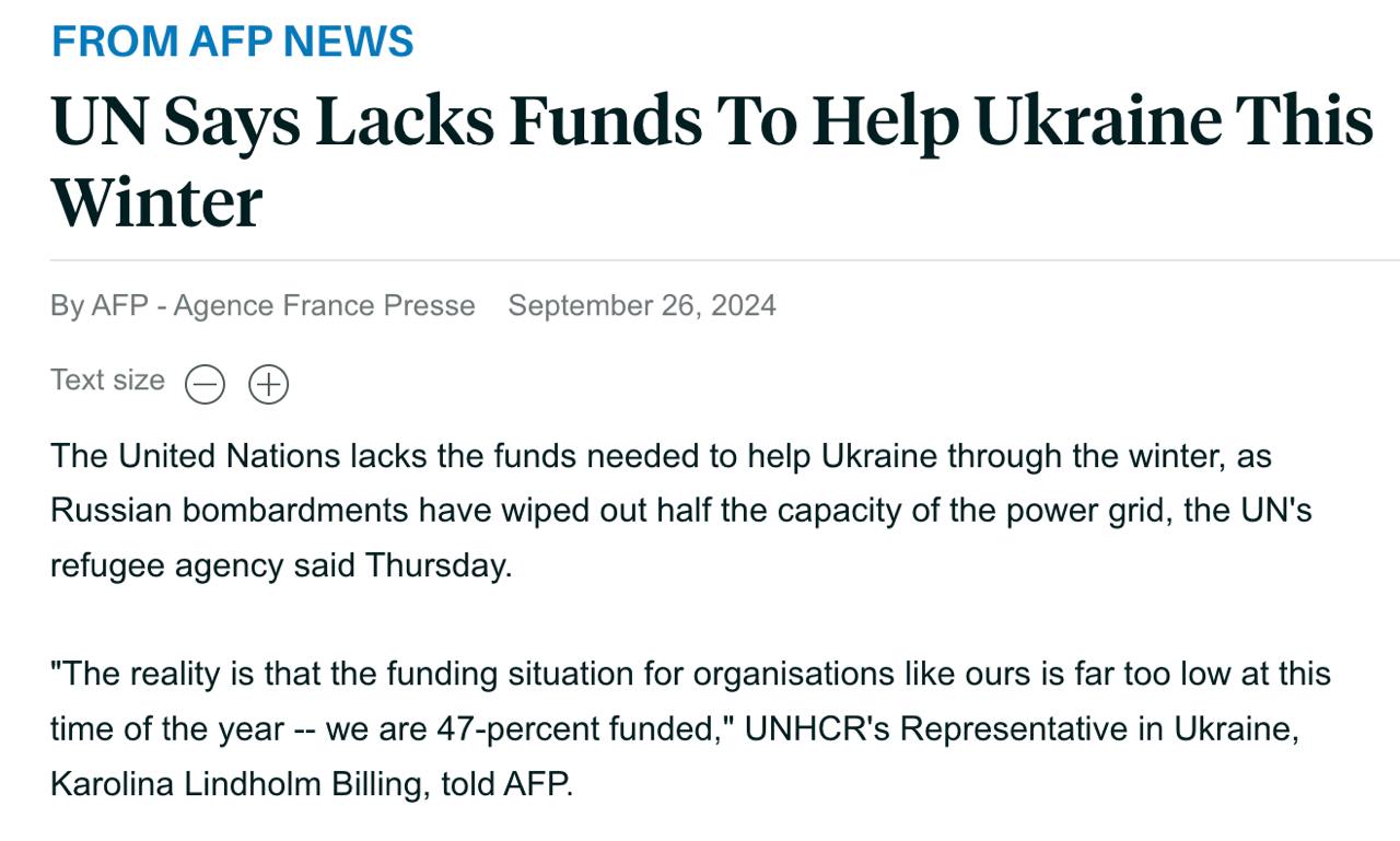 11:45 ООН заявляет, что ей не хватает средств для помощи Украине зимой.