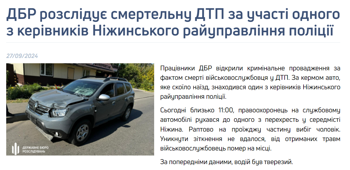 В Нежине один из руководителей местного райуправления полиции на служебном авто сбил насмерть военного. Об этом сообщает Государственное бюро расследований.
