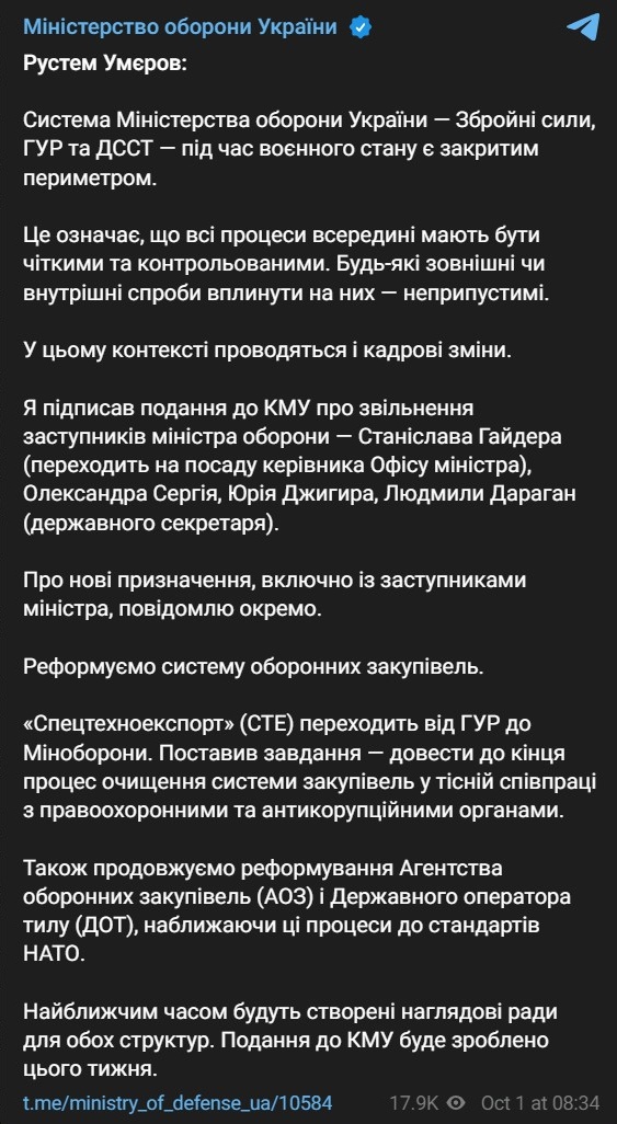 "Спецтехноэкспорт" (СТЭ) переходит от ГУР к Минобороны. Поставил задачу – довести до конца процесс очистки системы закупок в тесном сотрудничестве с правоохранительными и антикоррупционными органами", - отметил Умеров.