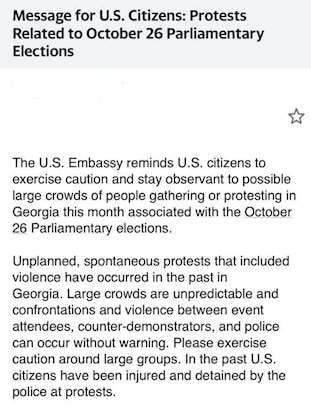 Посольство США в Грузии предупредило своих граждан о возможных "спонтанных акциях протеста" в Грузии на предстоящих 26 октября парламентских выборах.