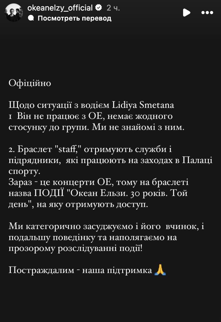 "Он не работает с "ОЭ", нет никакого отношения к группе. Мы не знакомы с ним. Браслет staff получают службы и подрядчики, работающие на мероприятиях во Дворце спорта. Сейчас – это концерты "ОЭ2, поэтому на браслете название события "Океан Эльзы. 30 лет. Тот день", на которое получают доступ", – говорится в сообщении группы.